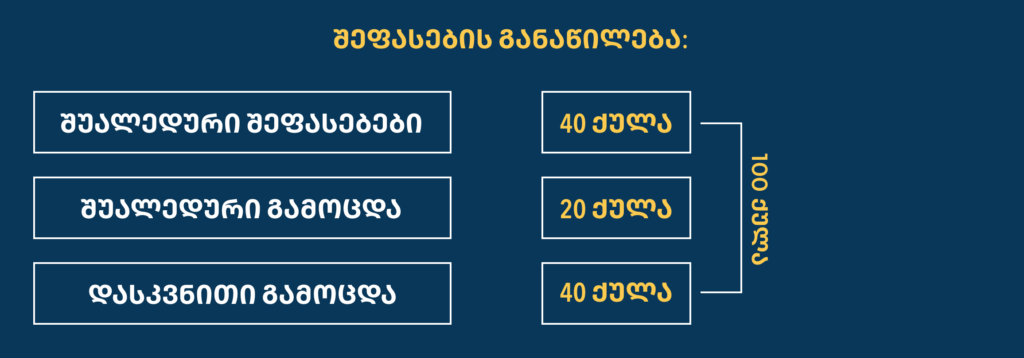 - მაქსიმალური შეფასება: სასწავლო კურსის შედეგების მაქსიმალური შეფასებაა 100 ქულა.