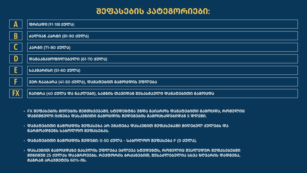 - დამატებითი გამოცდა: FX შეფასების მიღების შემთხვევაში, სტუდენტმა უნდა გაიაროს დამატებითი გამოცდა, რომელიც დანიშნული იქნება დასკვნითი გამოცდის შედეგების გამოცხადებიდან 5 დღეში.